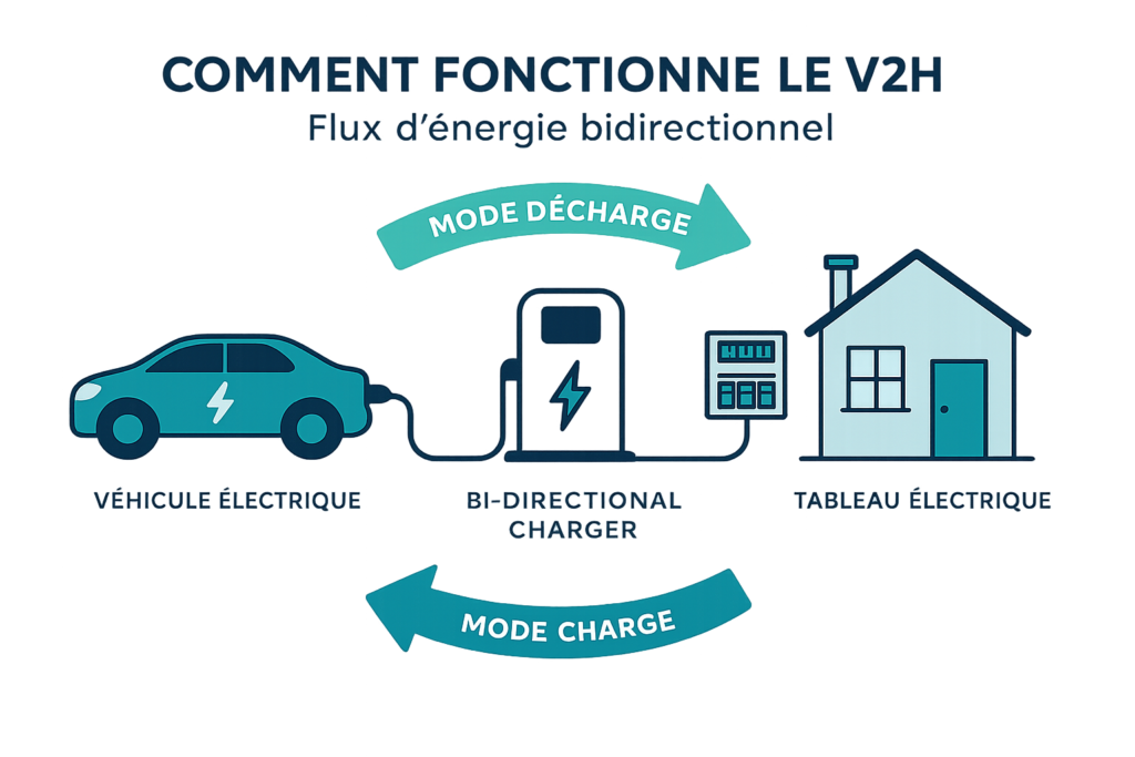 La borne de recharge bidirectionnelle, V2G (Vehicle to Grid) ou V2H (Vehicle to Home), est un équipement de nouvelle génération en cours de développement qui permettra non seulement de charger la batterie d’un véhicule électrique, mais aussi de renvoyer de l’électricité vers le réseau ou le logement.